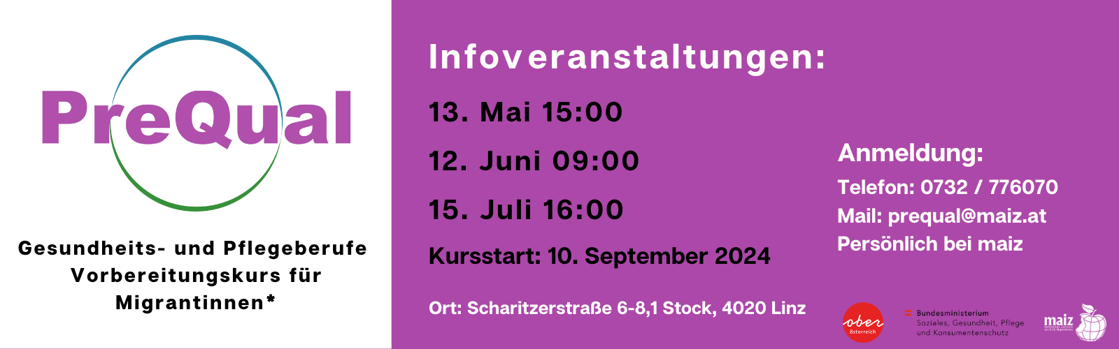 Wir nehmen laufend Anmeldungen für PreQual an: telefonisch unter 0732 / 776070, per E-mail a prequal@maiz.at oder persönlich in maiz, Scharitzerstraße 6-8, 4020 Linz.